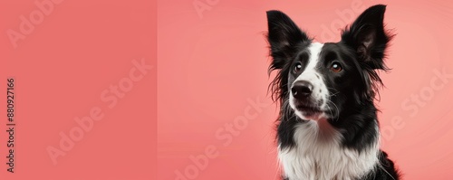 © Dalibor, Fototapeta premium A black and white dog with a curious look on its face on pink background. Free copy space for banner.