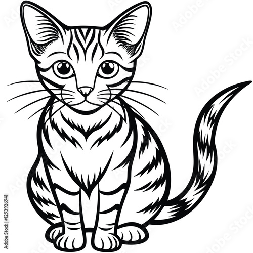 © shopone, Obraz premium A black and white drawing of a cat with a striped tail