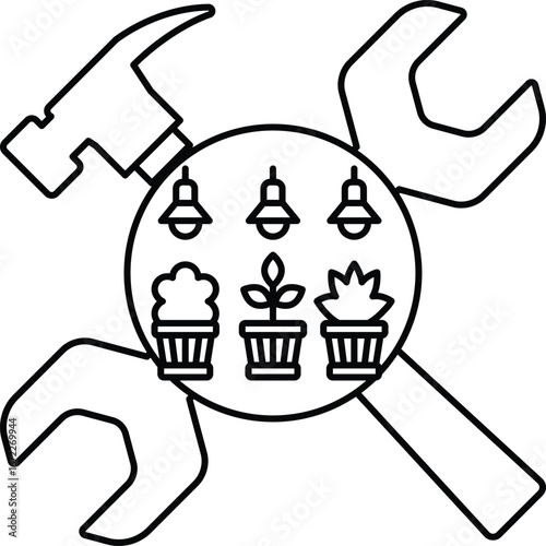 © toonsteb, Fototapeta premium A black and white drawing of a hammer, wrench, and light fixture