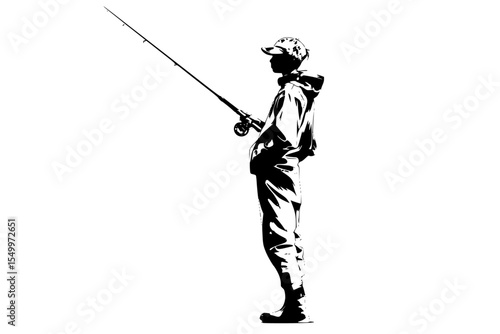 © Alloca Design Studio, Obraz premium a black and white drawing of a man or fisherman standing with a fishing rod in his hand black, boy, drawing, fish, fisherman, fishing rod, hand, man, person, silhouette, stand , Generative art.