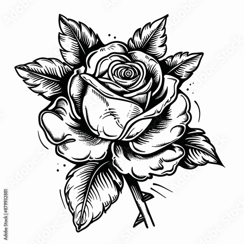© whitecityrecords, Fototapeta premium A black and white drawing of a rose with a stem. The rose is the main focus of the drawing and is surrounded by a leaf. The drawing has a vintage feel to it, and the black