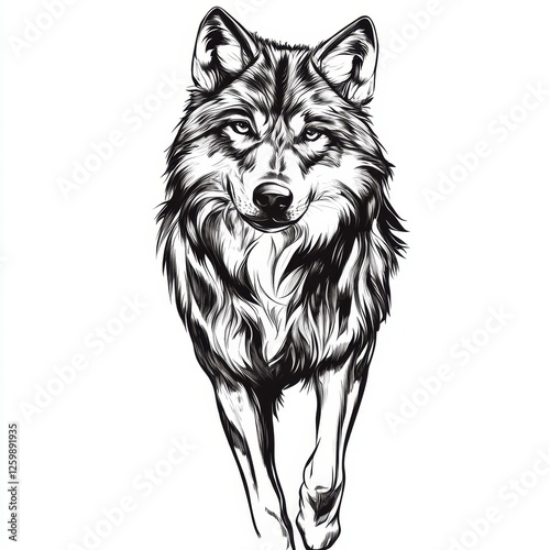 © Mikus, Naklejka premium a black and white drawing of a wolf on a white background The wolf is depicted in a realistic style, with its fur and features clearly visible Its eyes are wide a