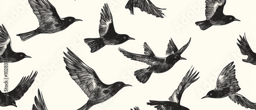 Fototapeta premium A black and white drawing of birds flying in a pattern
