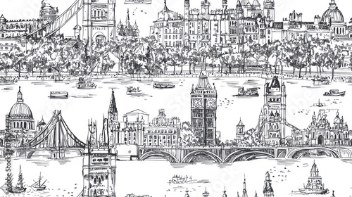 © WETDREAM, Fototapeta premium A black and white drawing of London with many buildings and boats