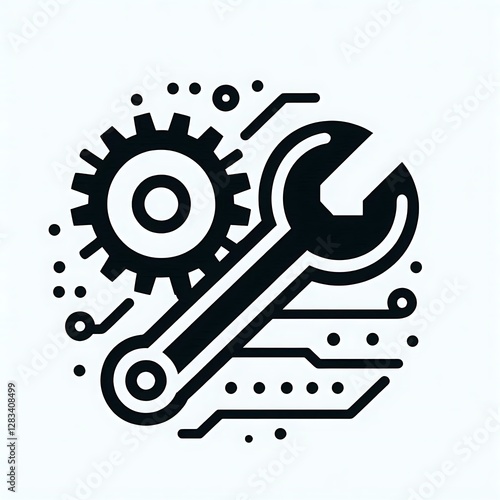 Fototapeta premium A black and white icon of a wrench and a gear, symbolizing tools and machinery, with circuit-like lines and dots around them, representing technology and engineering.