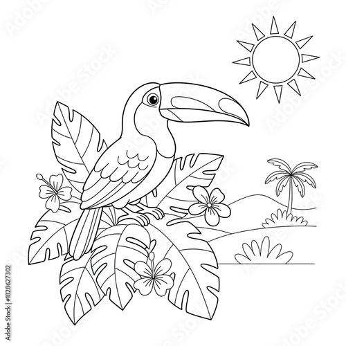 © SetCartoon, Obraz premium A black and white illustration of a toucan perched on tropical foliage under a sunny sky