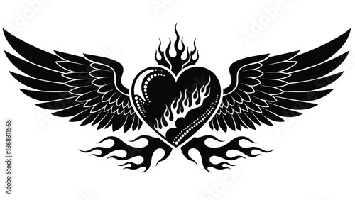 © Nasima, Fototapeta premium A black and white illustration of a winged heart engulfed in flames