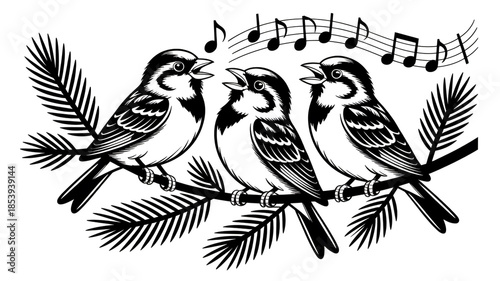 Naklejka premium A black and white illustration of three small birds perched on a pine branch.