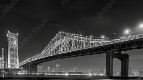 Fototapeta premium A black-and-white image of a bridge illuminated against a nighttime city...
