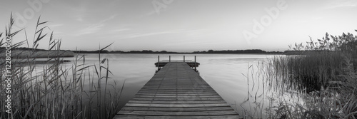 © lastfurianec, Naklejka premium A black and white image of a lake at sunset, over which a flock of birds flies. There is a wooden pier in the foreground, and tall grass grows along the water's edge. A banner with space for the text.