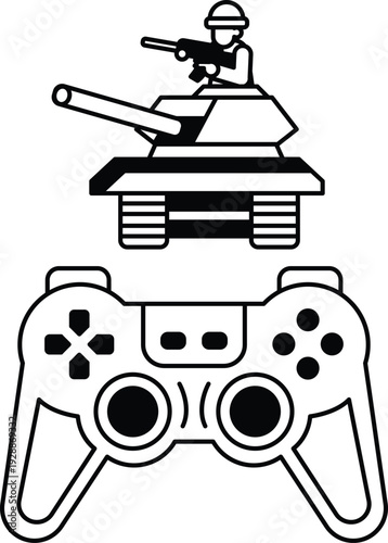 © toonsteb, Fototapeta premium A black and white image of a soldier holding a gun and a tank
