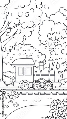 © Miftahul, Fototapeta premium A black and white image of a train in a natural landscape