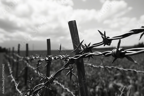 Fototapeta premium A black and white image showing a close-up of a barbed wire fence, with sharp spikes and twisted metal, symbolizing confinement and border.