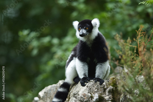 © mizmizstk, Obraz premium a black and white lemur sitting on a rock