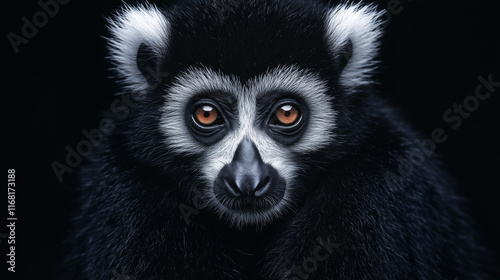 Naklejka premium A black-and-white lemur with striking orange eyes on a dark background