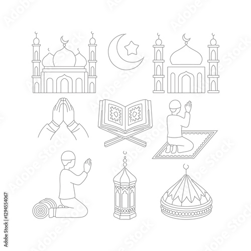 Fototapeta premium A black-and-white line art illustration featuring a set of Islamic-themed icons