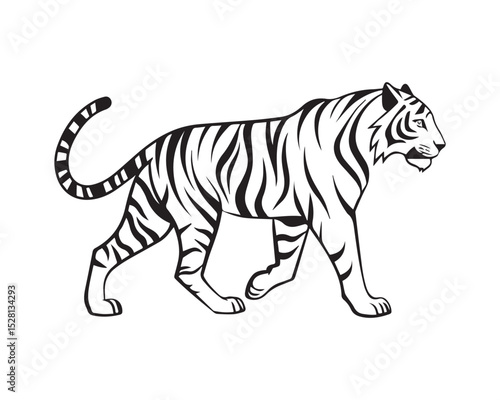 Fototapeta premium A black and white line drawing of a full tiger in profile view isolated on...