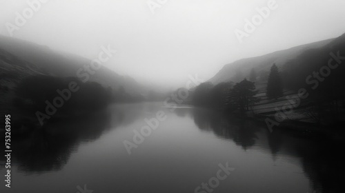 © Olga, Fototapeta premium a black and white photo of a body of water in the middle of a foggy day with mountains in the background.