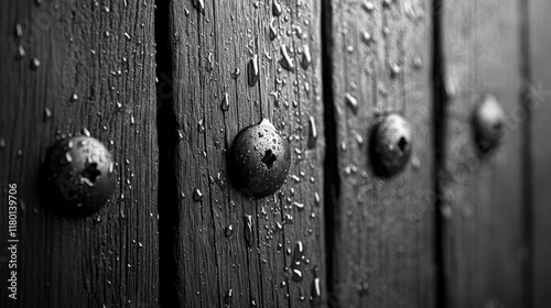 Fototapeta premium A black and white photo of a wooden door with water droplets on it
