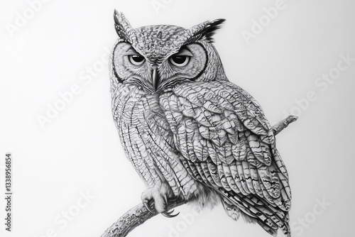 © AiArtVision, Naklejka premium a black and white photo of an owl sitting on a branch with a white background