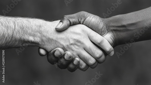 Fototapeta premium A black and white photo of two hands shaking, representing cooperation, diversity, and unity between different backgrounds.