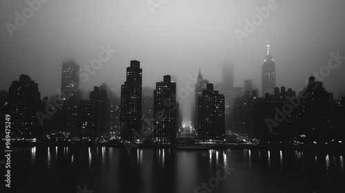 © Puttipong, Fototapeta premium A black and white photograph of a city skyline at dusk, with lights beginning to twinkle.