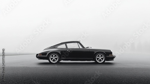 © Ксения Омельченко, Fototapeta premium A black and white photograph of a classic car parked on a grassy field in foggy conditions. The car is the main focus, and the foggy background creates a sense of mystery and timelessness.
