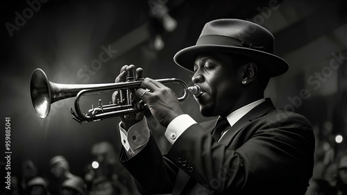 © R-CHUN, Obraz premium A black and white photograph of a stylish musician in a hat playing a trumpet onstage.