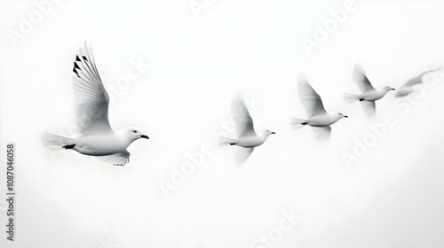 © HQAsset, Obraz premium A Black and White Photograph of Four Seagulls Flying in Formation Against a White, Cloudy Sky
