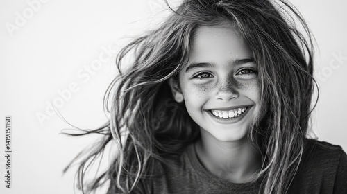 © Igor, Fototapeta premium A black and white portrait of a laughing child with wind in their hair.
