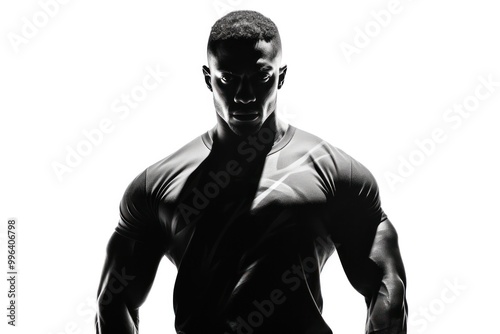 © Putt_Sanplee, Naklejka premium A black and white portrait of a muscular man with a defined six-pack, emphasizing the contrast between light and shadow