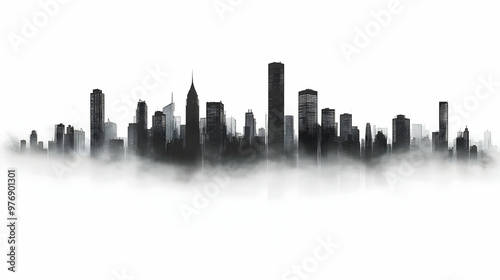 Fototapeta premium A black and white silhouette of a city skyline emerging from a sea of fog,...