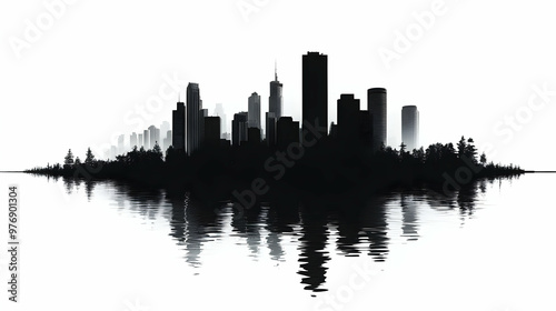 Fototapeta premium A black and white silhouette of a city skyline reflected in the water.