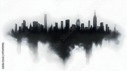 Fototapeta premium A black and white silhouette of a city skyline, with the bottom of the buildings dissolving into a cloud of smoke or fog.