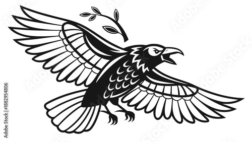Obraz premium A black and white vector illustration of an eagle in flight with an olive branch
