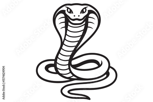 Fototapeta premium A black and white vector of a cobra, drawn with bold black outlines emphasizing its flared hood, coiled body, and intense gaze.