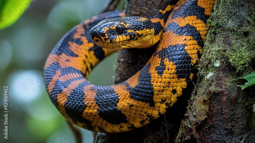 © Pic, Fototapeta premium A black and yellow snake with its head tilted up and wrapped around a mossy tree trunk in a rainforest.