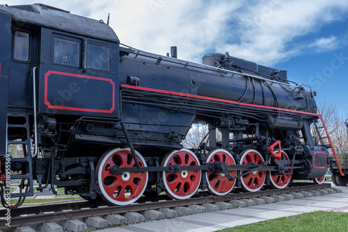 © Eduard Belkin, Naklejka premium A black antique steam locomotive. The mainline passenger steam locomotive of the last century. Old railway transport. Transportation by rail.