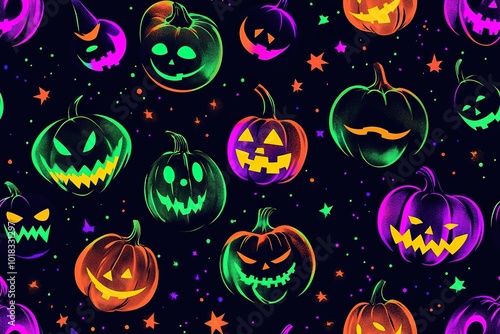 Fototapeta premium A black background with a colorful, glowing pattern of cartoon Halloween faces. High quality