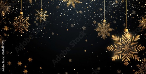 © SKIMP Art, Naklejka premium A black background with golden, glittering snowflakes hanging from the corners, creating an elegant and festive atmosphere for Christmas or New Year's celebration designs Generative AI
