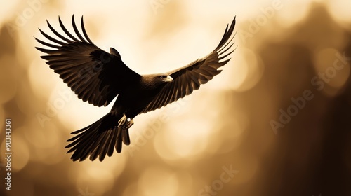 Obraz premium A black bird in flight, wings splayed broadly