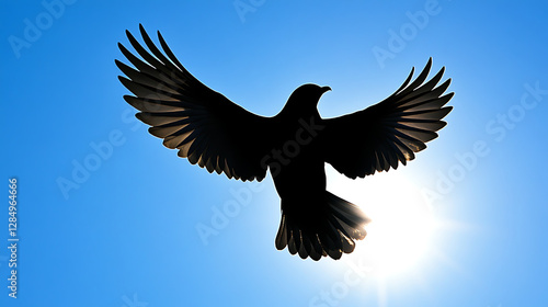 © Watcharin, Obraz premium A black bird is flying in the sky with the sun shining on it