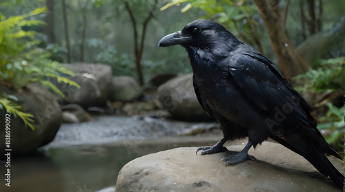 © Masum, Fototapeta premium a black bird sitting on a rock in the woods