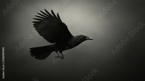 © kept, Obraz premium A black bird soaring gracefully against a dark background.