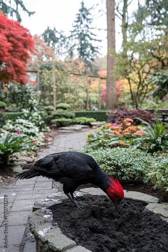 © isti, Naklejka premium A black bird with a red crest forages in a garden filled with colorful plants and trees.