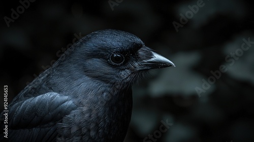 © Olga, Fototapeta premium A black bird with black head, body, wings, and a white beak in close-up