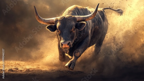 Naklejka premium A black bull charges forward kicking up dust in a dramatic, action-packed pose.