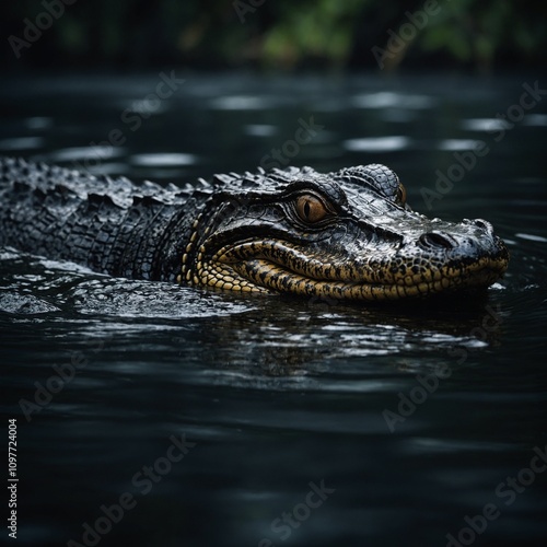 © Hameed, Fototapeta premium A black caiman gliding silently through dark Amazon waters.