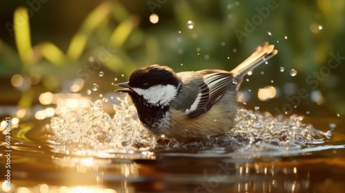 Obraz premium A Black-Capped Chickadee bird taking a bath in a puddle.