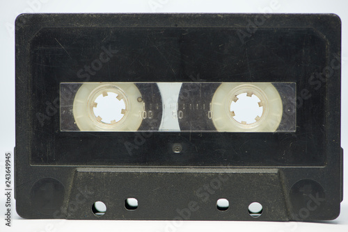 © vicenfoto, Obraz premium A black cassette tape on a white background